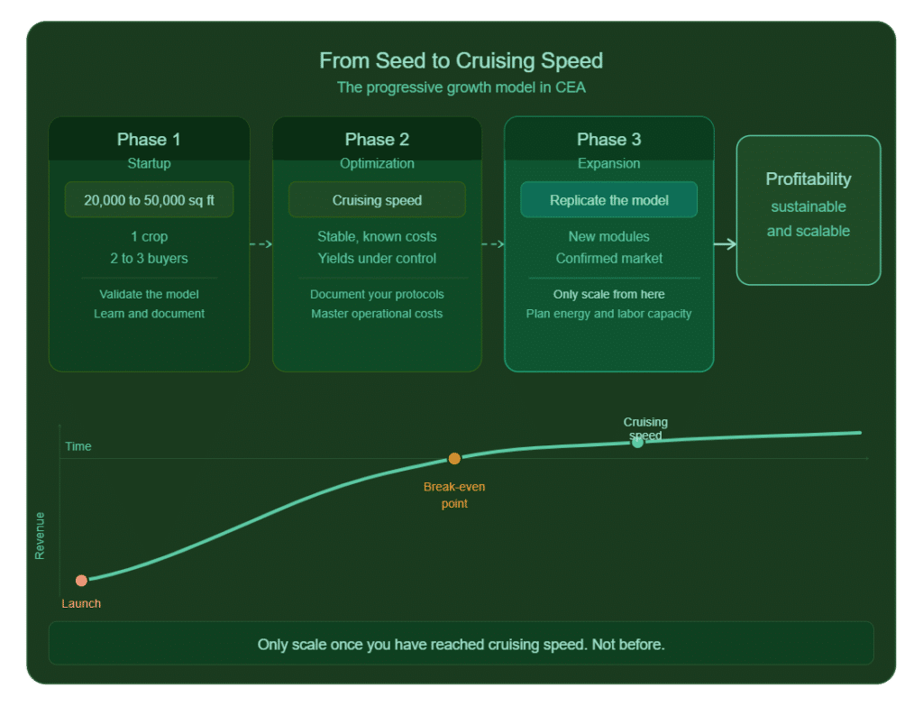 This is the most expensive mistake in CEA, and it’s the most common. An enthusiastic operator raises capital, builds a 100,000 sq ft facility on day one, and, six months later, finds themselves crushed by fixed costs while the team is still learning the basics on an oversized infrastructure.