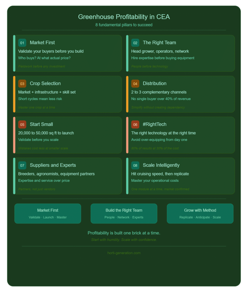 The most profitable greenhouse isn’t the one that starts fastest or spends the most. It’s the one that executes in the right sequence: validate the market, build a strong team, master one crop, then grow only once the model has proven itself. Every disciplined decision you make today is a crisis you avoid tomorrow.