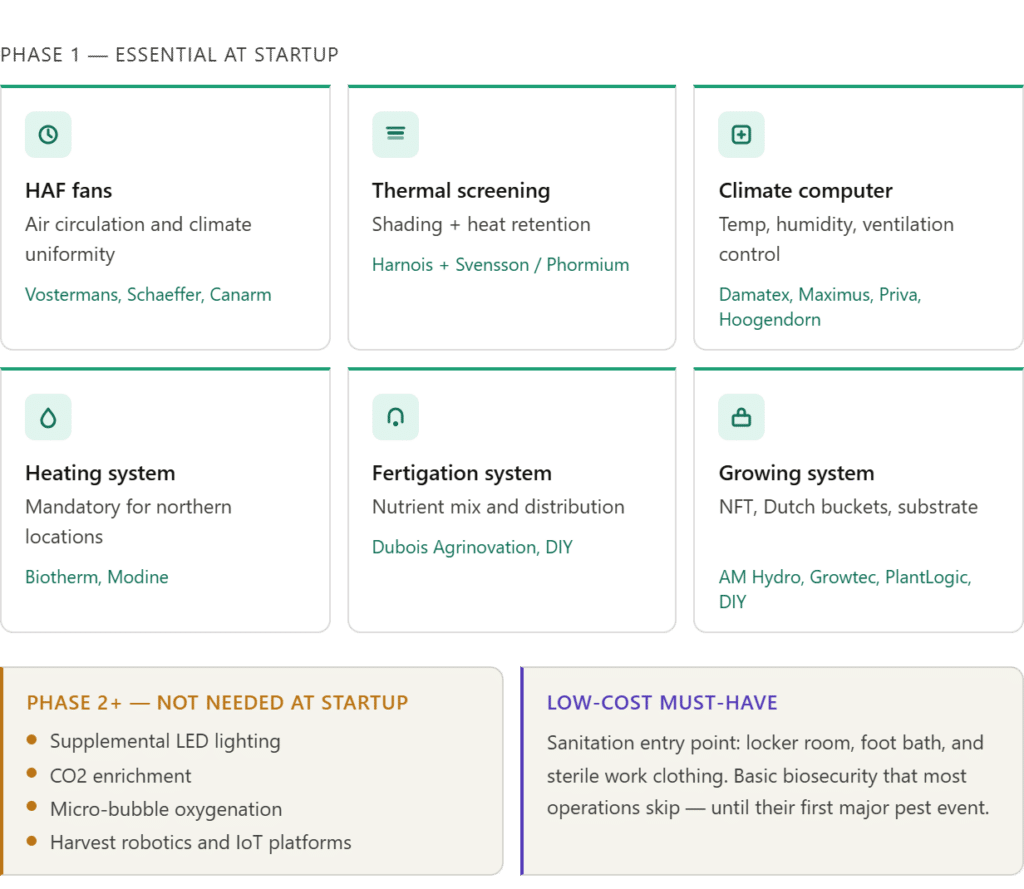A climate control computer is essential, but you do not need the most sophisticated system on the market at startup. Platforms from Damatex, Maximus, Priva, or Hoogendorn all have entry-level configurations that handle temperature, humidity, ventilation, and screening logic with precision. Master the fundamentals of one system before considering upgrades.